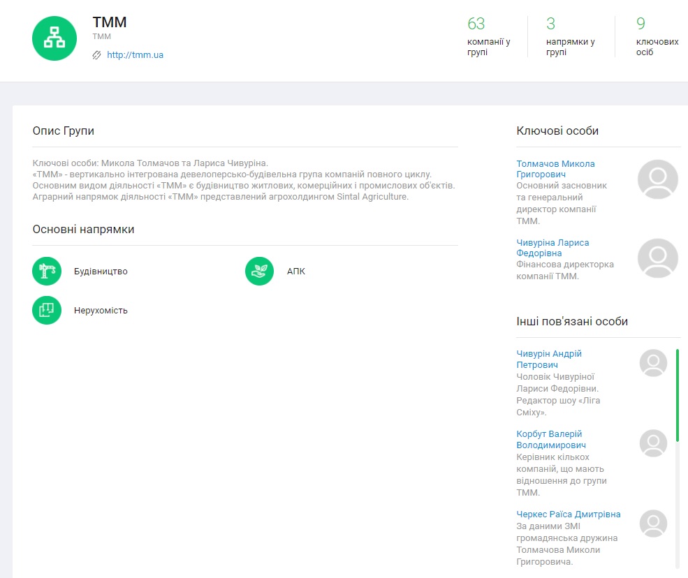 Система Youcontrol относит ООО “Фирма “Т.М.М.” к одноименной группе компаний “ТММ”, объединяющей 63 компании, занятых в сфере строительства, девелопинга и аграрного бизнеса. Ключевые лица данной группы – ее основатель Николай Толмачев и финансовый директор некоторых компаний этой группы Лариса Чивурина.
