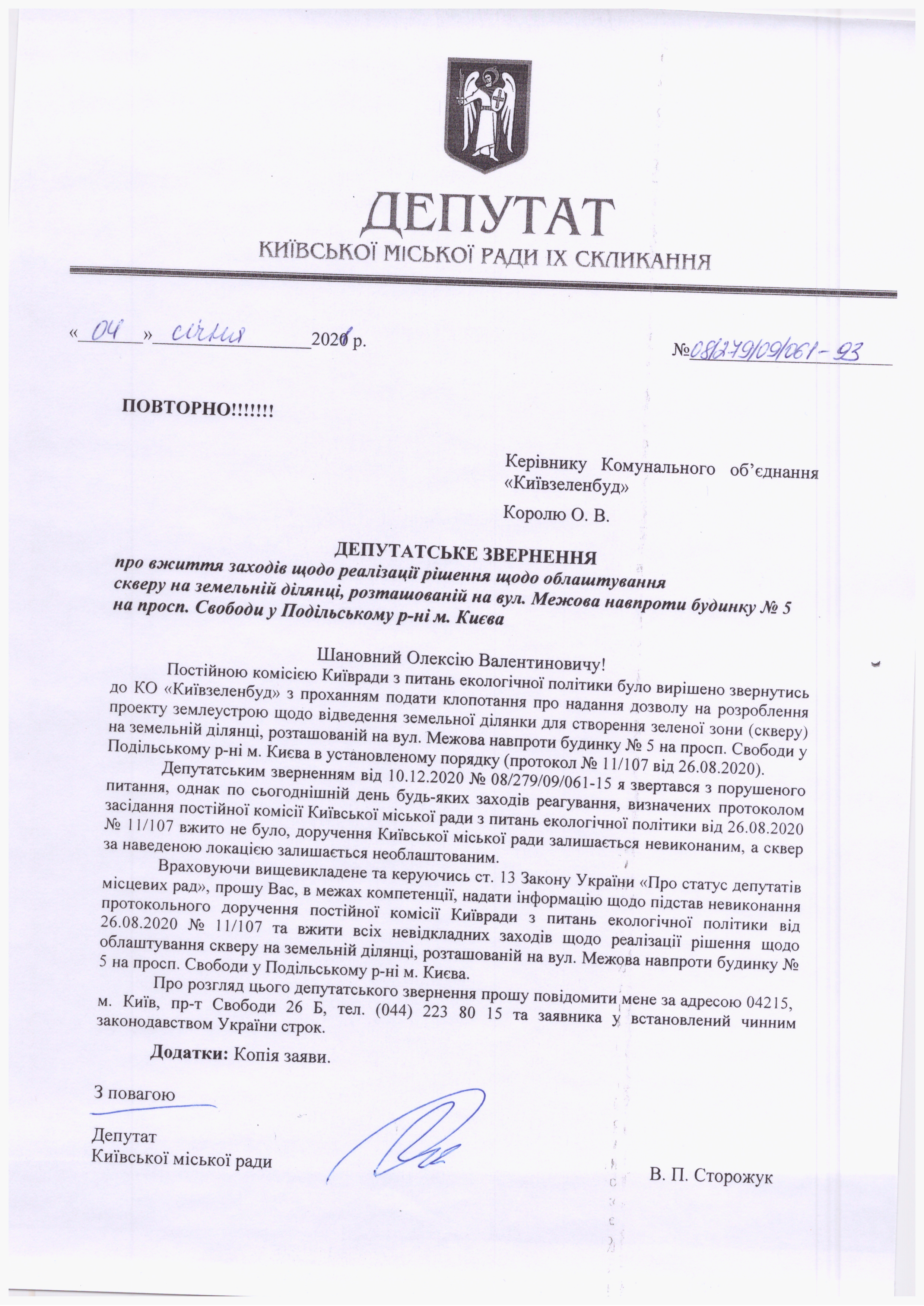 По информации депутата, постоянная комиссия Киевсовета по вопросам экологической политики в августе 2020 года обратилась с поручением к КО “Киевзеленстрой” инициировать вопрос разработки проекта землеустройства для отвода земельного участка под зеленую зону (сквер). Как отмечает Сторожук, на сегодня это поручение остается невыполненным, сквер на данной локации так и не появился.