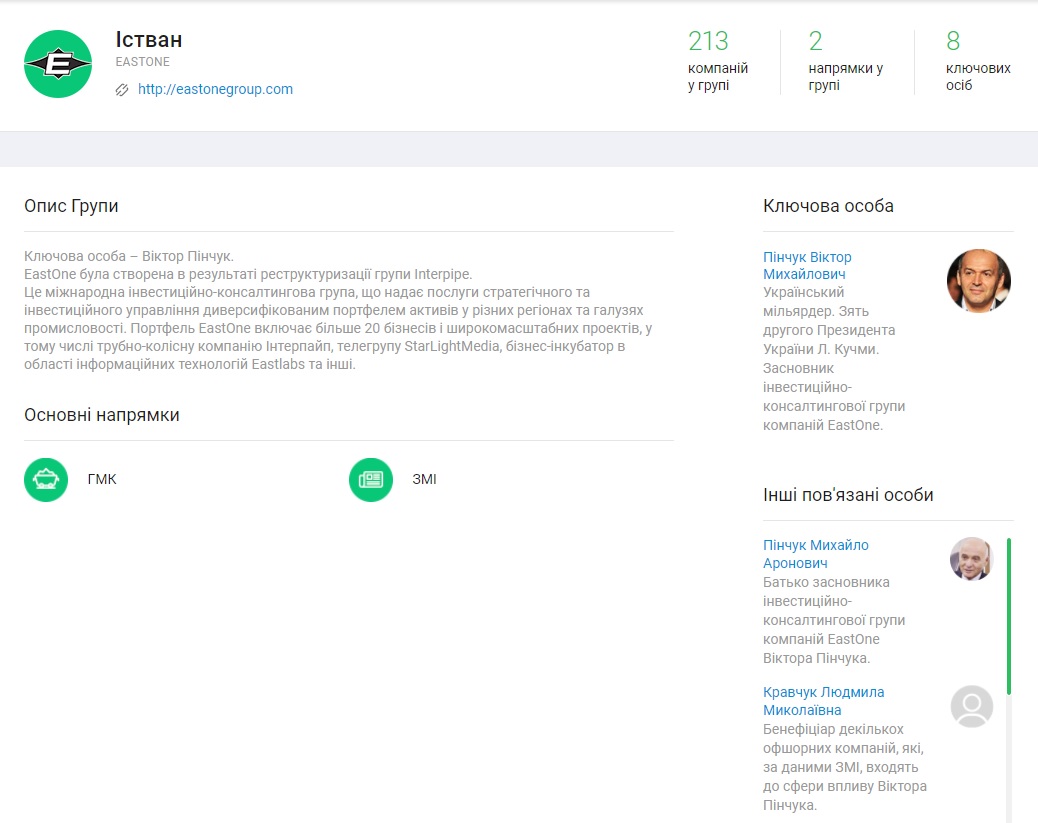 Система Youcontrol относит ПФК “Приднепровье” и ООО “Днепрэкология” к группе “Истван” (“ EastOne”), которая объединяет порядка двух десятков бизнесов и широкомасштабных проектов, в том числе трубно-колесную компанию Интерпайп, телегруппу StarLightMediа и т.д. Ключевое лицо данной группы – украинский миллиардер, зять второго президента Украины Леонида Кучмы Виктор Пинчук.