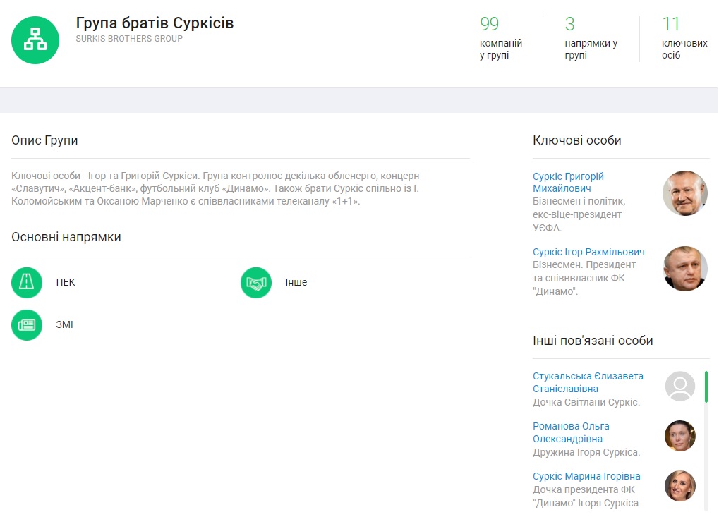 Система Youcontrol відносить ТОВ “КУА Мтір Ессет Менеджмент” і ТОВ “ФК “Динамо “Київ” до групи братів Суркісів, яка контролює кілька обленерго, концерн “Славутич”, “Акцент-банк”, футбольний клуб “Динамо” (Київ) тощо. Ключовими особами цієї групи є Григорій Суркіс (народний депутат кількох скликань, ексвіцепрезидент УЄФА, експрезидент Федерації футболу України) та Ігор Суркіс (президент футбольного клубу “Динамо”, бізнесмен, на колажі в центрі).