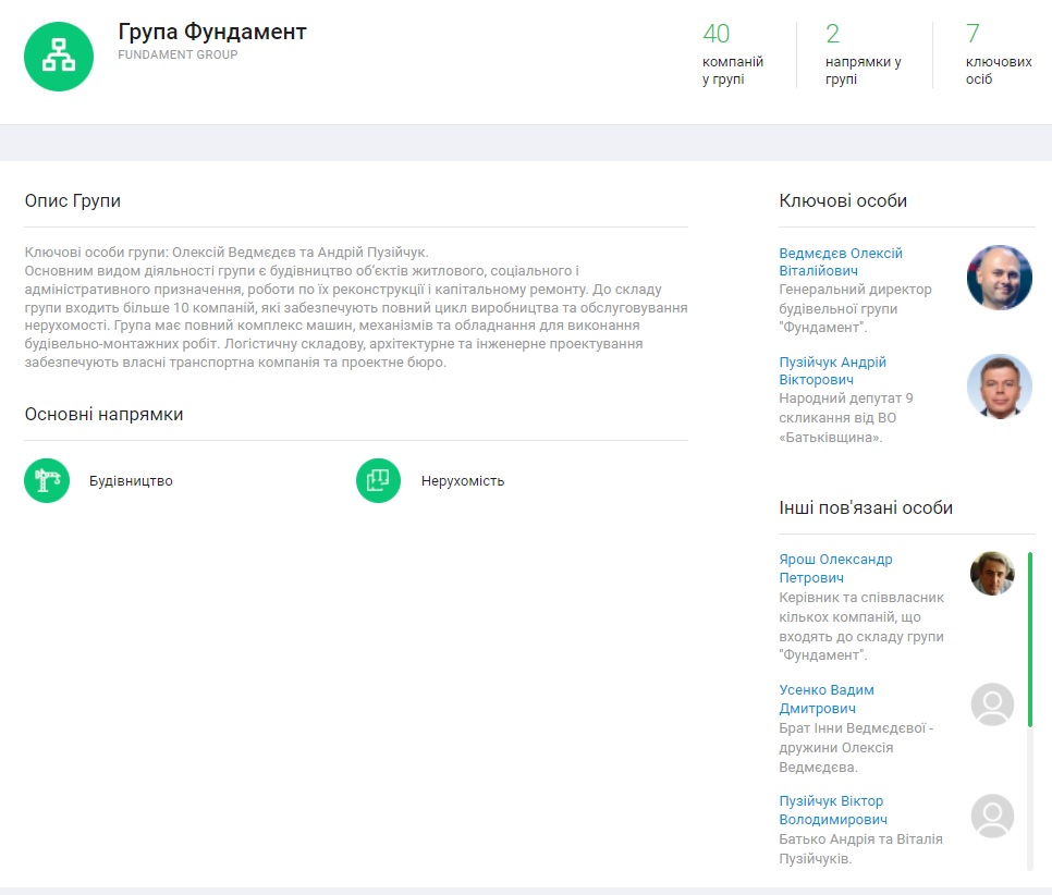 Система Youcontrol відносить ТОВ “Фундамент БМУ-1”, ТОВ “Фундамент Девелопмент” і ТОВ “Фундамент Сервіс” до так званої “групи Фундамент”. Вказана група спеціалізується на будівництві об’єктів житлового, соціального та адміністративного призначення тощо, а до її складу входить близько чотирьох десятків компаній, які забезпечують повний цикл виробництва та обслуговування нерухомості. Ключовими особами цієї групи є її генеральний директор, згаданий вище підприємець Олексій Ведмедєв і народний депутат України діючого IX скликання Андрій Пузійчук (фракція “ВО “Батьківщина”).