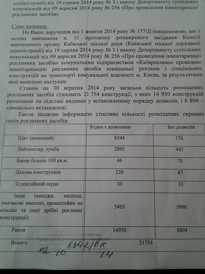 Несмотря на то, что с той поры количество легальных конструкций вроде бы выросло, немало рекламных носителей волшебным образом утратили легитимность. К примеру, в адресной базе “Киеврекламы” числится всего девять транспарантов-перетяжек. А по данным КГГА в сентябре 2014 года на улицах легально висела 1981 перетяжка: в трехсторонних договорах с КП “Киевпасстранс” она указана как “специальная рекламная конструкция на перекладинах между опорами освещения и контактной сети”.