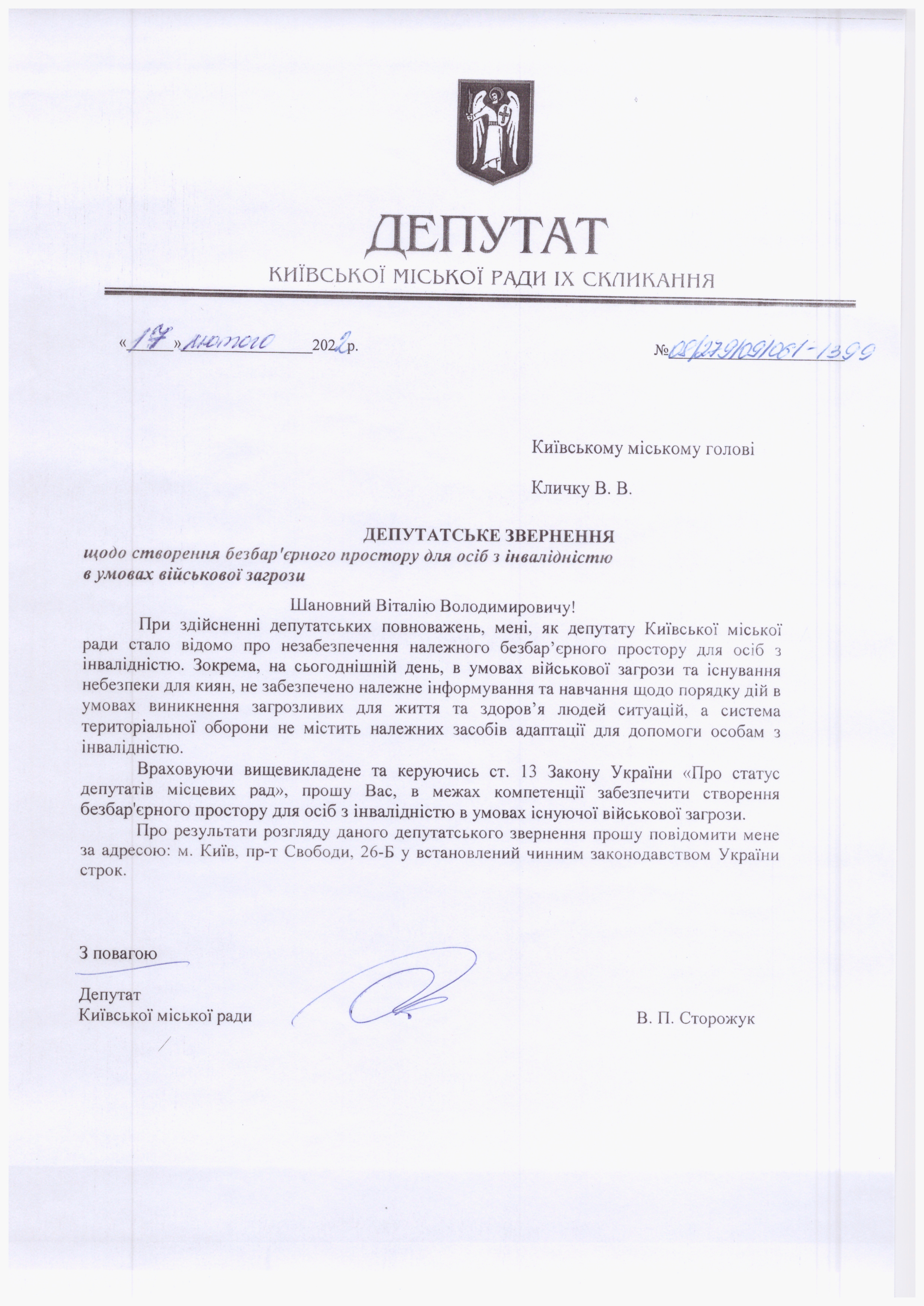 Депутат Киевсовета Вадим Сторожук (фракция “Европейская солидарность”) попросил Киевского городского голову Виталия Кличко создать безбарьерное пространство для лиц с инвалидностью в условиях военной угрозы.