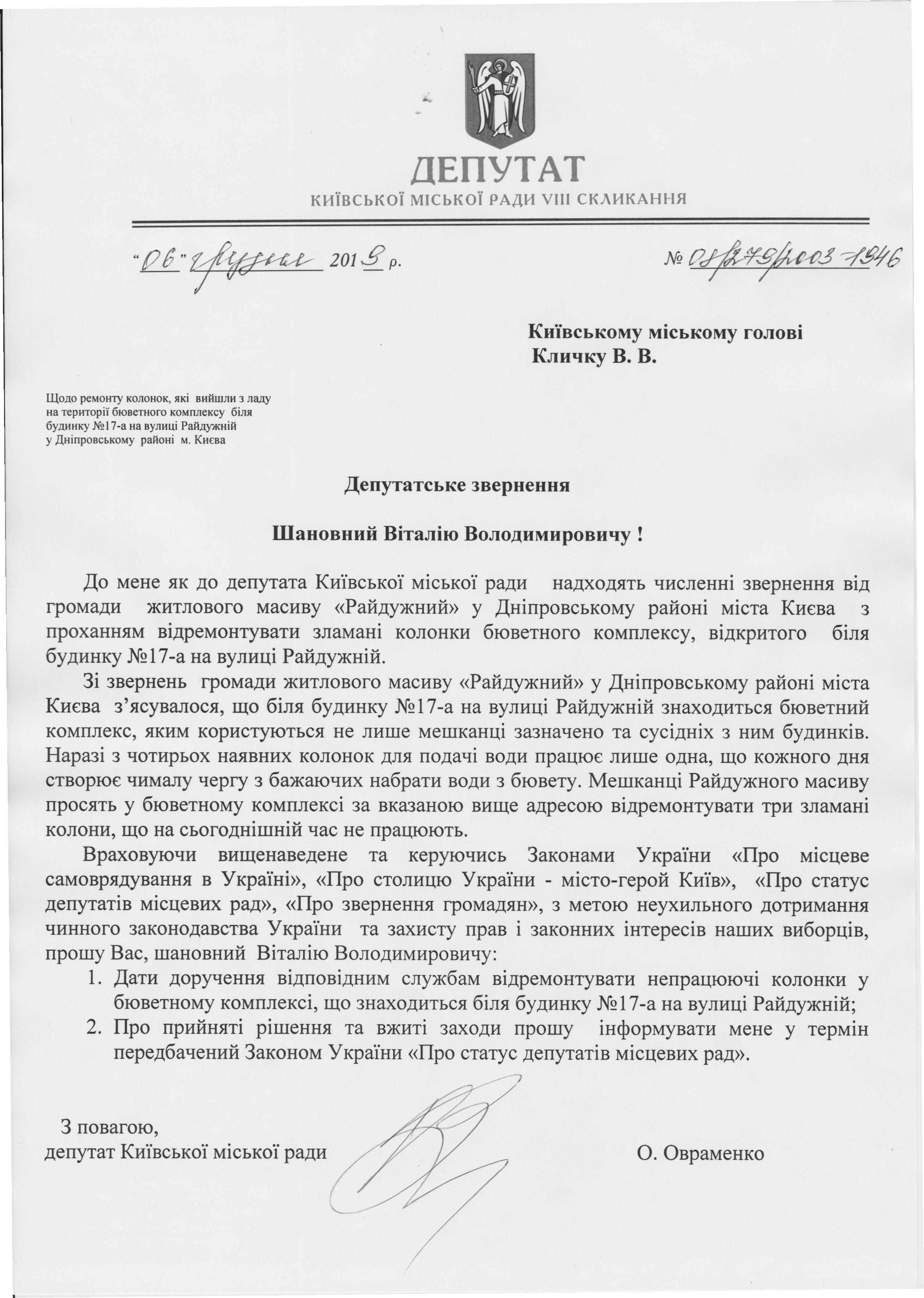 “Из обращений общины жилого массива “Радужный” в Днепровском районе Киева выяснилось, что у дома №17-а на улице Радужной находится бюветный комплекс, которым пользуются не только жители указаного, но и соседних с ним домов. Сейчас из четырех имеющихся колонок для подачи воды работает только одна, что каждый день создает большую очередь из желающих набрать воду из бювета”, – говорится в тексте обращения.