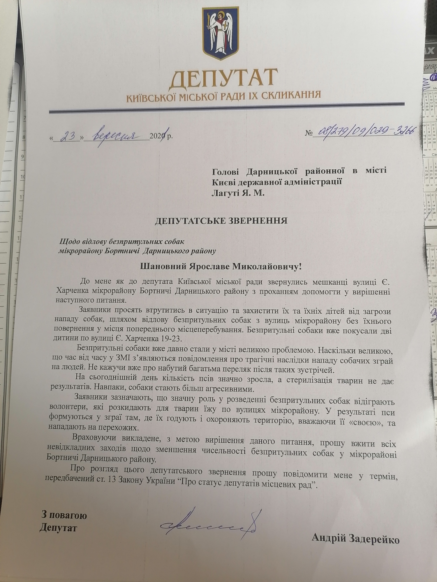 Депутат Андрей Задерейко (фракция “Европейская солидарность”) попросил главу Дарницкой РГА Ярослава Лагуту организовать отлов бездомных собак в микрорайоне Бортничи.