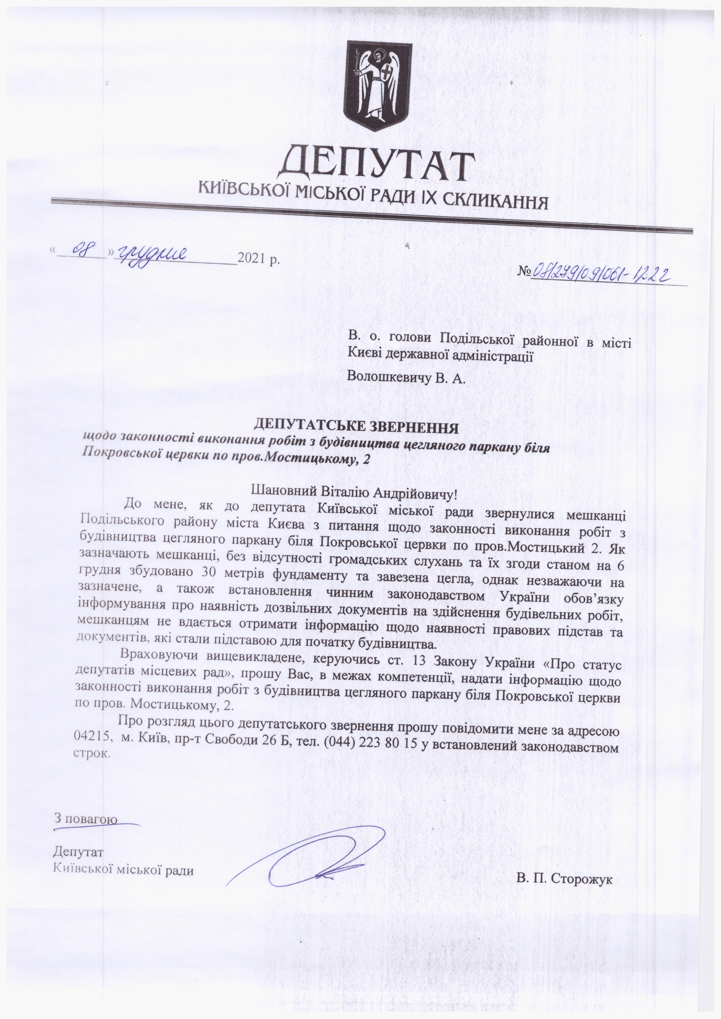 Депутат Вадим Сторожук (фракция “Европейская солидарность”) попросил и. о. главы Подольской РГА Виталия Волошкевича проверить законность строительства кирпичного забора возле Покровской церкви в пер. Мостицком, 2 в Подольском районе Киева.