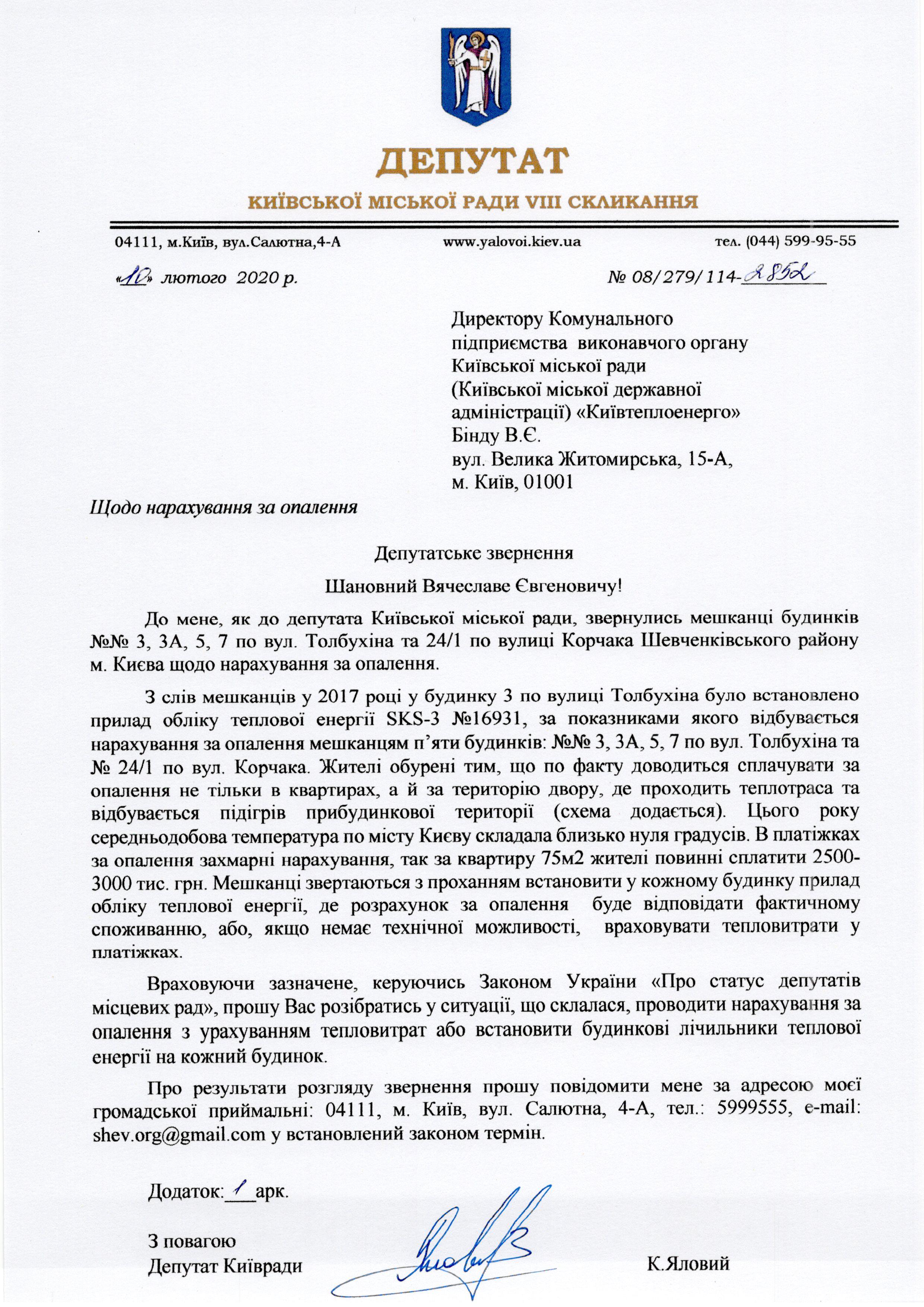 Глава комиссии Киевсовета по вопросам экологической политики Константин Яловой (фракция “Единство”) попросил директора КП “Киевтеплоэнерго” Вячеслава Бинда произвести перерасчет за отопление для жилых домов №№3, 3А, 5, 7 по ул. Толбухина и дома №24/1 по ул. Корчака Шевченковского района Киева. Дело в том, что начисление для всех этих домов производится по одному теплосчетчику, который был установлен в 2017 году в доме по улице Толбухина, 3.