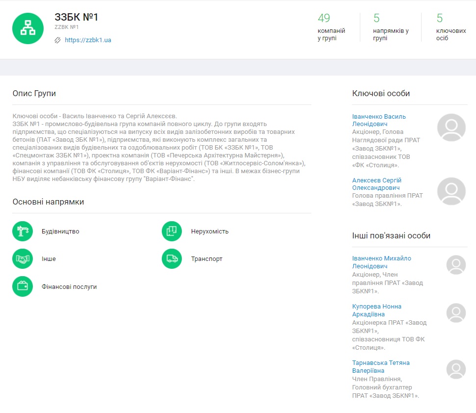 Система Youcontrol относит упомянутое ООО к одноименной промышленно-строительной группе “ЗЗБК №1” (“Завод залізобетонних конструкцій”), которая объединяет 49 компаний, специализирующихся на выпуске железобетонных изделий и товарных бетонов, строительстве и отделочных работах, проектной деятельности и т.д. Ключевые лица этой группы – упомянутый выше Сергей Алексеев и Василий Иванченко.