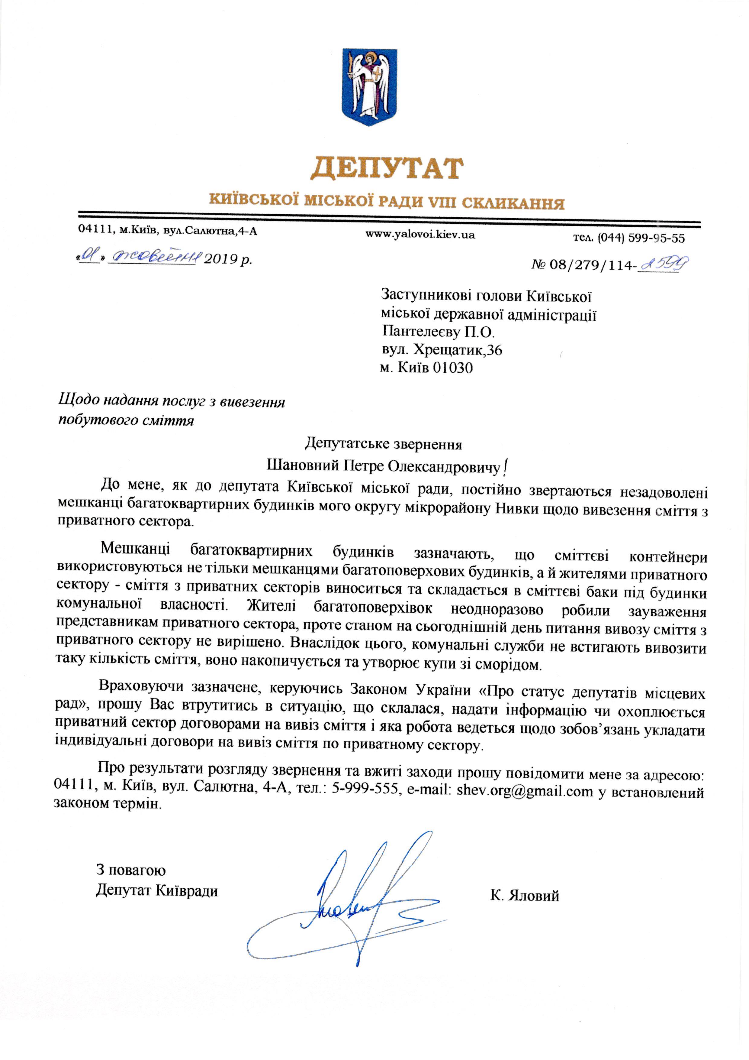“Ко мне, как к депутату Киевского городского совета, постоянно обращаются недовольные жители многоквартирных домов моего округа микрорайона Нивки по поводу вывоза мусора из частного сектора”, – пишет Яловой в депутатском обращении.