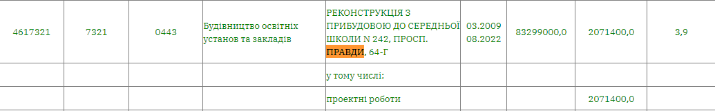 Как стало известно KV из объявления электронной системы публичных закупок ProZorro, 21 июля 2020 года управление капитального строительства, архитектуры и землепользования Подольской РГА заключило договор с ООО “Ж.О.К” (*) на проведение реконструкции с пристройкой к зданию средней общеобразовательной школы № 242 Подольского района на проспекте Правды, 64-Г. Цена договора составила 154,48 млн гривен.