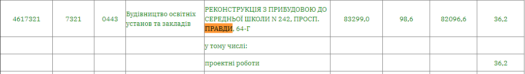 Средства на реконструкцию школы № 242 начали предусматривать в столичном бюджете начиная с 2017 года: в 2017 году было предусмотрено 943,8 тыс. гривен на проектные работы; в 2018 году – 36,2 тыс. гривен на проектные работы, в 2019 году – 2,07 млн гривен на проектные работы. В текущем году из городской казны планируют профинансировать лишь проектные работы в сумме 1,2 млн гривен, средства на проведение реконструкции не заложены.