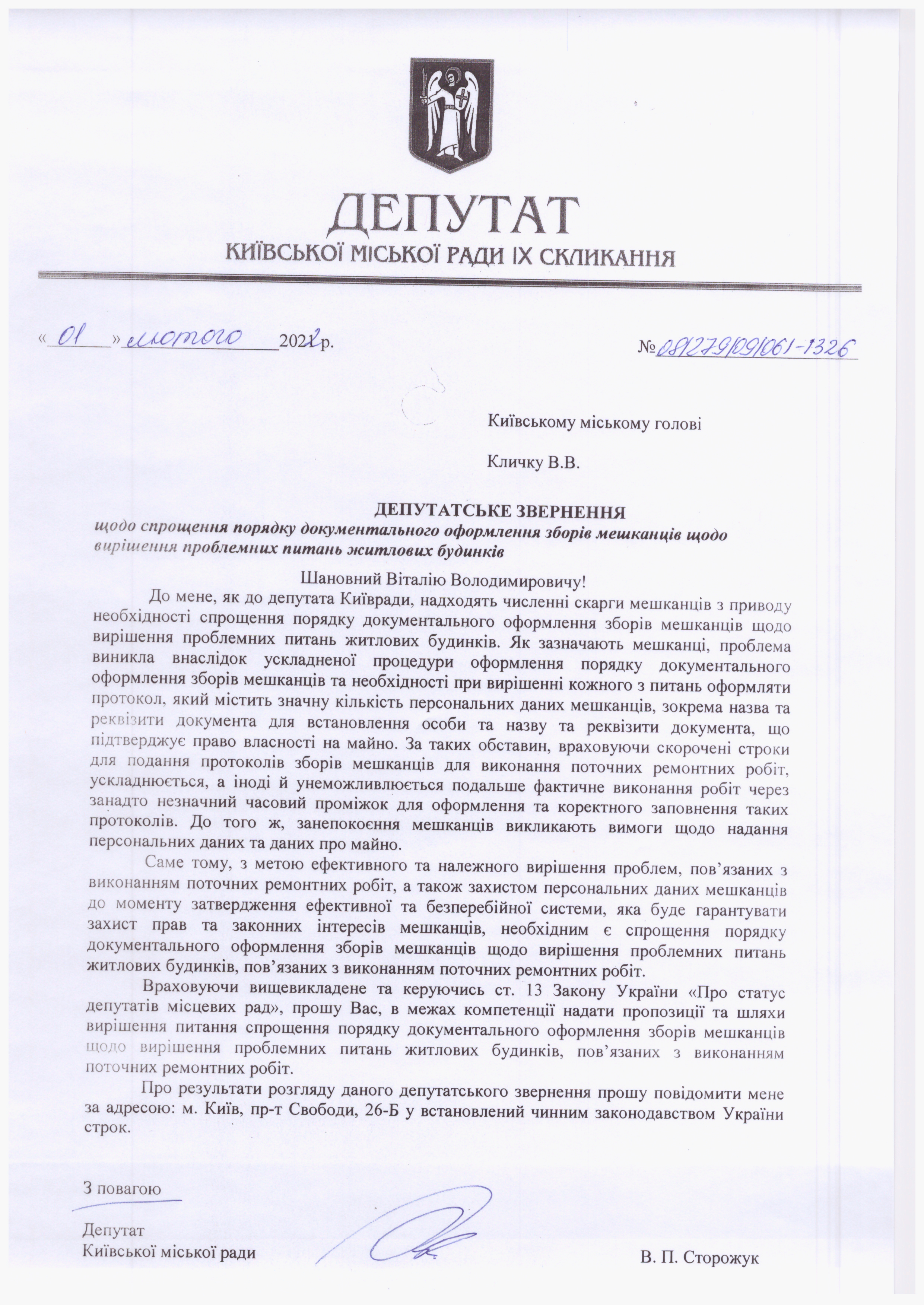 Депутат Вадим Сторожук (фракция “Европейская солидарность”) попросил Виталия Кличко упростить порядок документального оформления результатов собраний жителей, на которых определяются проблемные вопросы жилых домов.