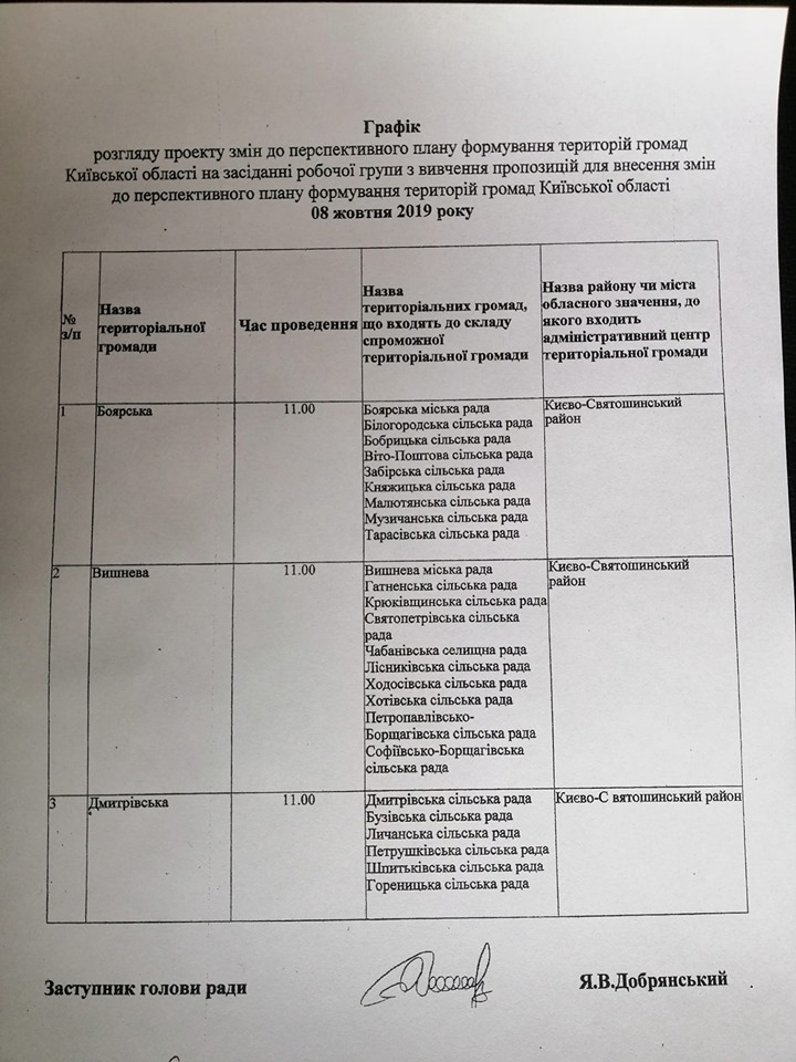 Заседание рассматривало вопрос внесения изменений в перспективный план формирования территорий Боярской, Вишневой и Дмитровской ОТО Киево-Святошинского района.