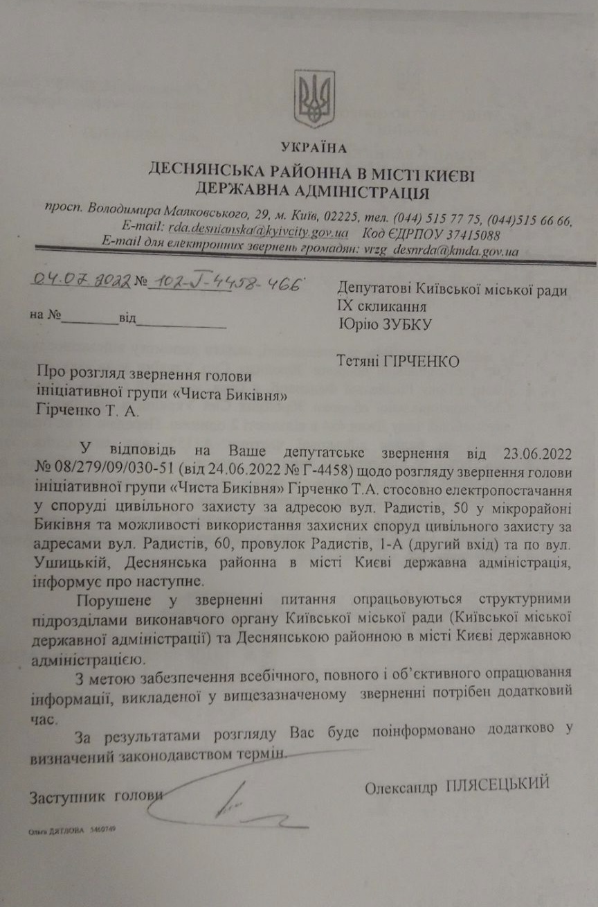 Юрія Зубко у своєму попередньому зверненні від 23 червня 2022 року щодо зазначеного питання проінформував Віталія Кличко, що до нього звернулася голова ініціативної групи “Чиста Биковня” Тетяна Гірченко. Вона розповіла, що на території мікрорайону Биківня збереглися декілька споруд цивільного захисту – бомбосховищ, які донедавна були занедбані і завалені сміттям. Зокрема, на початку року активісти Биківні власними силами прибрали та облаштували бомбосховише по вул. Радістів, 50 (бомбосховище №10403), де знайшли прихисток до 100 осіб одночасно. І зараз громаді необхідна допомога в приєднанні цього бомбосховища до електро- та водопостачання.