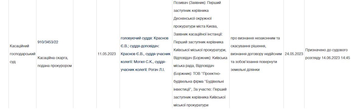 Паралельно з цим, у травні 2022 року, Деснянська окружна прокуратура Києва звернулася до Господарського суду столиці з позовом щодо визнання незаконним та скасування вищезгаданого рішення Київради щодо поновлення договорів оренди ділянок загальною площею 0,21 га. Крім того, правоохоронці заявили про вимоги щодо визнання недійсною укладеної угоди від 4 жовтня 2021 року про поновлення договору оренди та щодо повернення ділянок до комунальної власності громади Києва.