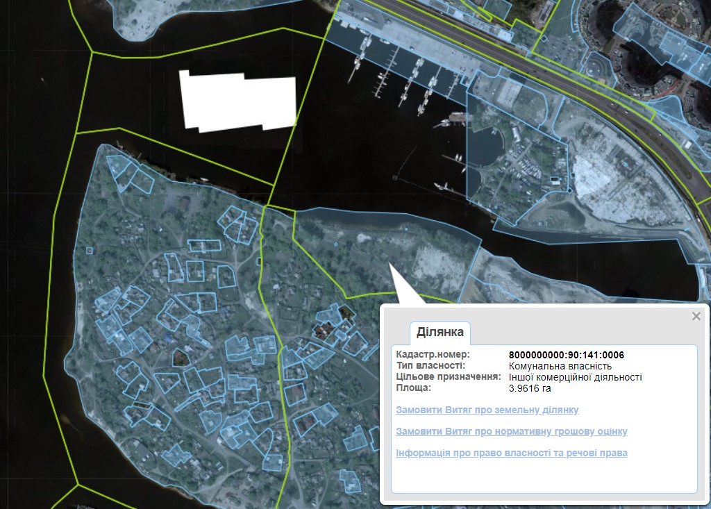 площадью 3,9616 га (кадастровый номер 8000000000:90:141:0006) на Днепровской набережной (район затоки Берковщина). Арендатор – ЧП “Орест”. Целевое назначение: для строительства, эксплуатации и обслуживания зоны отдыха (развлекательный комплекс, кафе-бар-ресторан, теннисные корты, ландшафтная площадка).