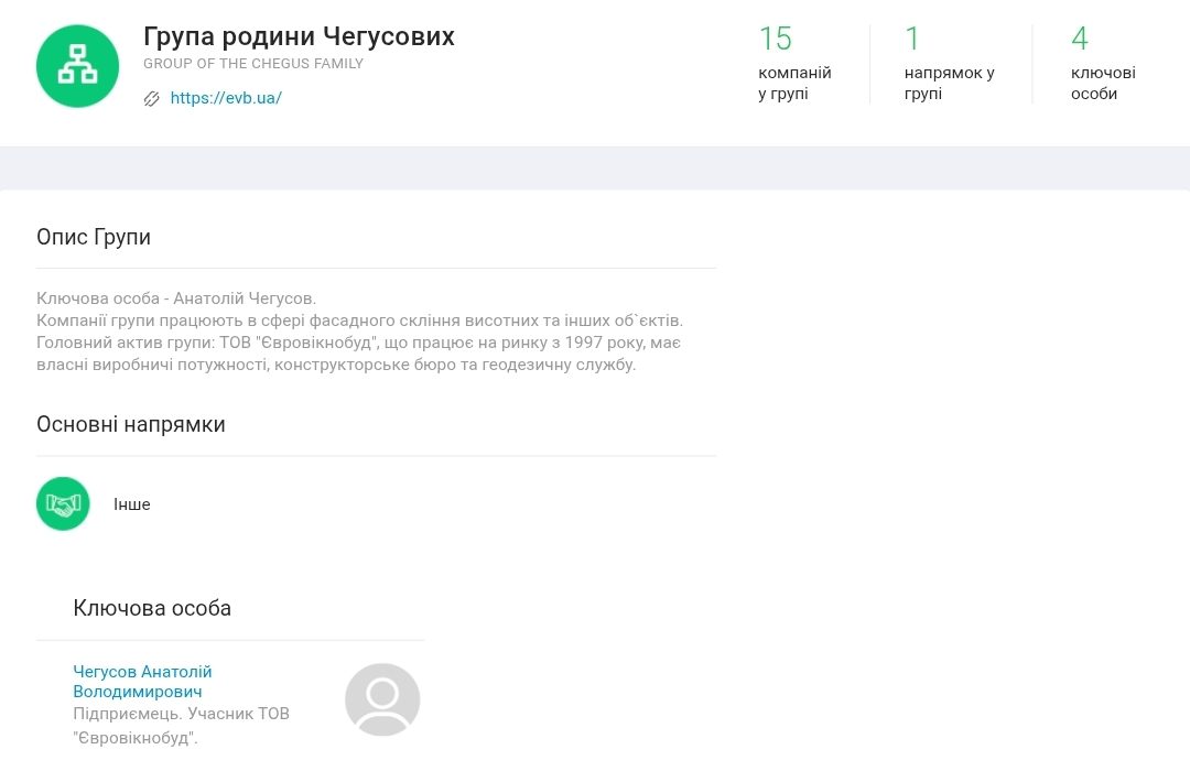 До групи родини Чегусових система Youcontrol відносить 15 компаній, які працюють у сфері фасадного скління висотних та інших об`єктів. Головним активом групи є ТОВ “Євровікнобуд”, що працює на ринку з 1997 року, має власні виробничі потужності, конструкторське бюро та геодезичну службу. Ключовою особою вказаної групи є підприємець Анатолій Чегусов.