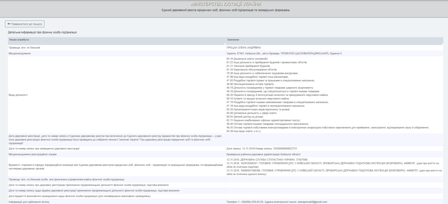 Согласно данным ЕГР, как физическое лицо-предприниматель, Елена Процак зарегистрирована в ноябре 2018 года. В основном ее деятельность связана с дошкольным образованием, однако, в реестре значится еще также и уборка домов и промышленных помещений, обслуживание объектов, торговля и т.д.
