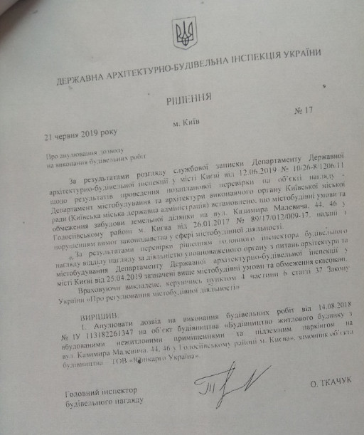 Однако в 2019 году было отменено действие двух важных документов, без которых невозможно легально продолжить строительство ЖК. Так, Государственная архитектурно-строительная инспекция (ГАСИ) 25.04.2019 года отменила действие градостроительных условий и ограничений (ГУО) № 89/17012009-17. Они были выданы Департаментом градостроительства и архитектуры КГГА 26.01.2017 года для ООО “Промстрой”. А 21 июня 2019 года ГАСИ аннулировала и разрешение на выполнение строительных работ по ул. Казимира Малевича, 44, 46.