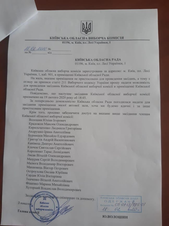 Попереднє засідання комісії мало проходити 19 лютого о 18:45 в кабінеті 901 приміщення Київської обласної ради — про це у своєму листі 18 лютого просив голова комісії Юліан Волошин. Що ж до перебігу засідання комісії 2 березня, воно проходило у закритому режимі, куди журналістів не допустили.