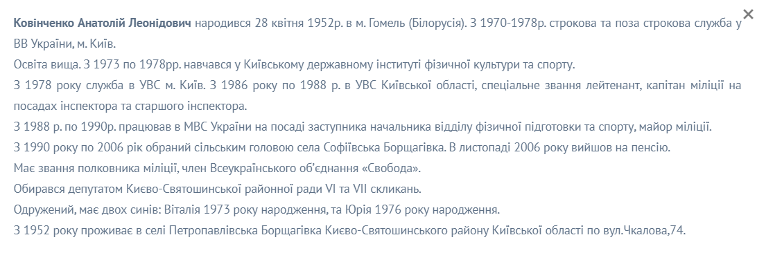 Анатолій Леонідович Ковінченко – перший кандидат, член партії, пенсіонер та депутат Києво-Святошинської районної ради VІ та VІІ скликань (фракція “Свобода”). Народився він 28 квітня 1952 року в Гомелі та проживає нині у Петропавлівській Борщагівці. Навчався у Київському державному інституті фізичної культури та спорту. З 1986 по 1988 роки працював в УВС Київської області на посадах інспектора та старшого інспектора.