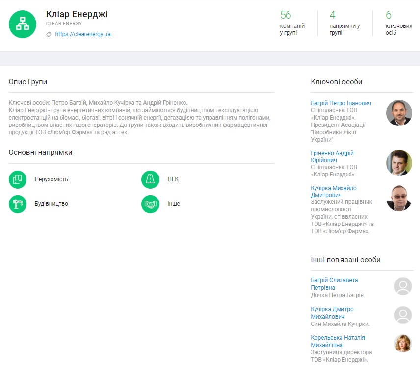 Система Youcontrol относит ООО “БМВП “Современник” и ООО “Портал Трейд” к группе “Клиар Энерджи”, которая объединяет 56 компаний, занятых в сфере альтернативной энергетики и фармацевтического бизнеса (производитель медпрепаратов “Люмьер Фарма” и ряд аптек). Совладельцами данной группы являются Андрей Гриненко, Михаил Кучирка и Петр Багрий. Последний известен как Президент Ассоциации “Производители лекарств Украины”.