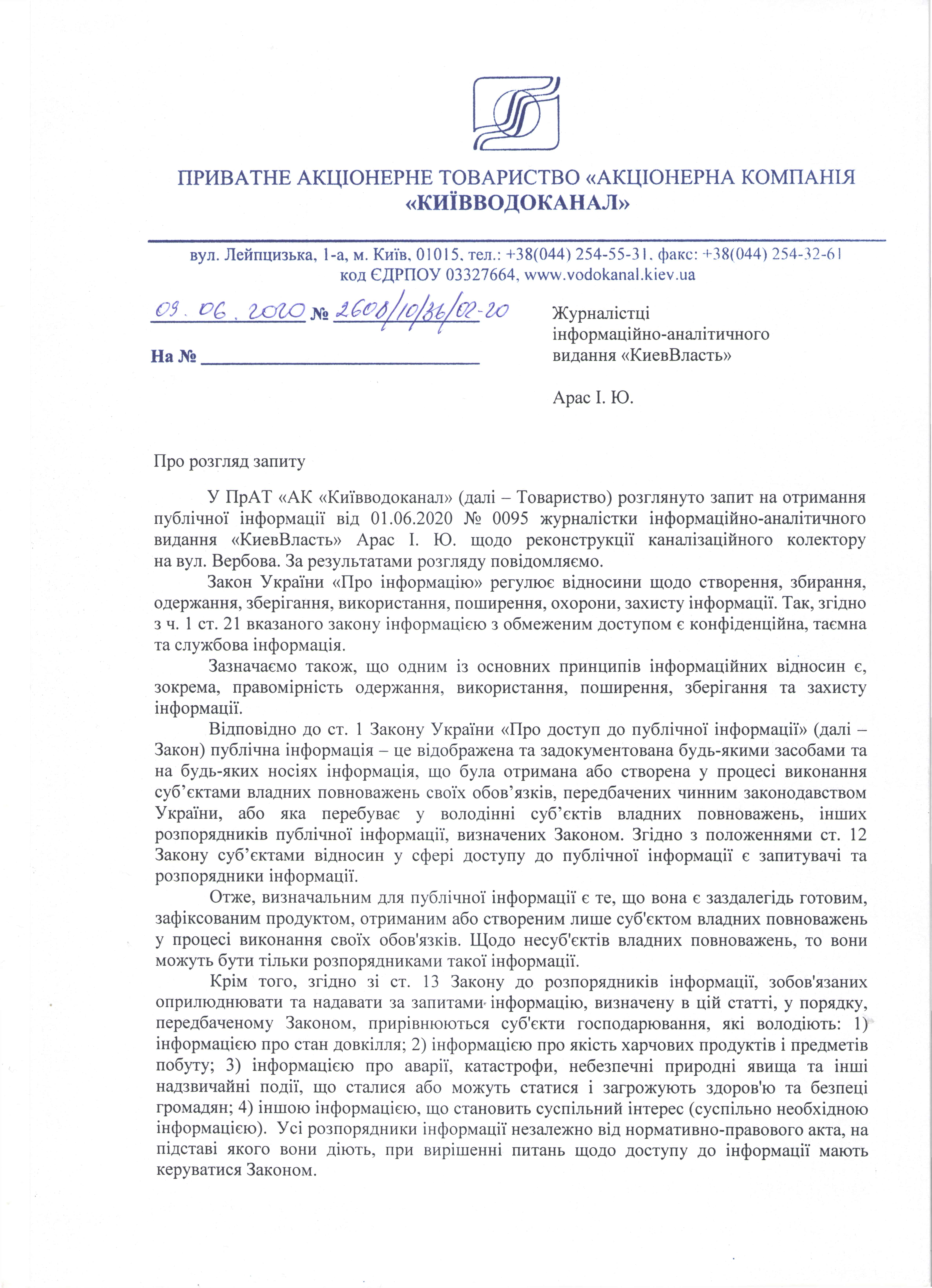 Тендер на проведение реконструкции коллектора на Вербовой в 2019 году в системе ProZorro KV найти не удалось. Из-за этого редакция запросила у “Киевводоканала” информацию о том, когда, у кого и за какую сумму ЧАО заказывало эти работы, и выполнены ли они. Вместо ответов на эти вопросы, в “Киевводоканале” лишь процитировали несколько статей законов “Об информации” и “О доступе к публичной информации”, не предоставив журналистам какой-либо информации по сути.