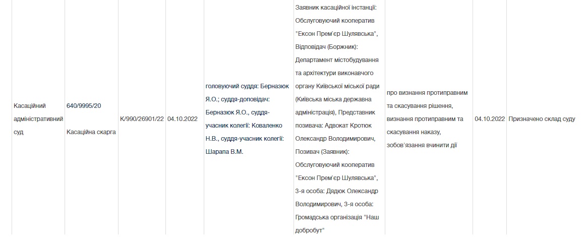 Як стало відомо KВ, найближчим часом має відбутися засідання Касаційного адмінсуду Києва за позовом ОК “Ексон Прем’єр Шулявська” (*) до Департаменту містобудування та архітектури КМДА (справа №640/9995/20).