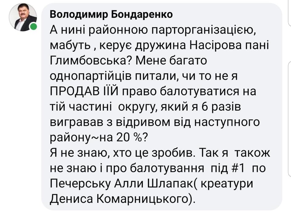 Бондаренко подчеркнул, что не знает, кто и за какие деньги расчистил место для Глимбовской, устранив предварительно руководителя районной организации, и заверил, что не продавал свой округ бывшей жене Насирова.